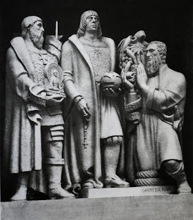 Há oferta e acolhimento naquelas figuras, no entanto, a iniciativa generosa do homem é diferente da dádiva da mulher. Complementam-se, oferecem-se, não se copiam. Não nos passa pela cabeça separar o grupo escultórico em duas partes, apesar de as duas esculturas serem, de facto, peças totalmente soltas. Nem nos imaginamos a rodar as figuras, de modo que deixassem de estar uma diante da outra, frente a frente. À medida que a atenção se prende aos pormenores, começamos a perceber que, para além de uma tonalidade idêntica e de serem constituídos por um mesmo material, não há verdadeiramente duplicação entre o homem e a mulher. Cada figura requer a outra e a simetria consiste nessa correspondência, mais do que na exactidão da forma.